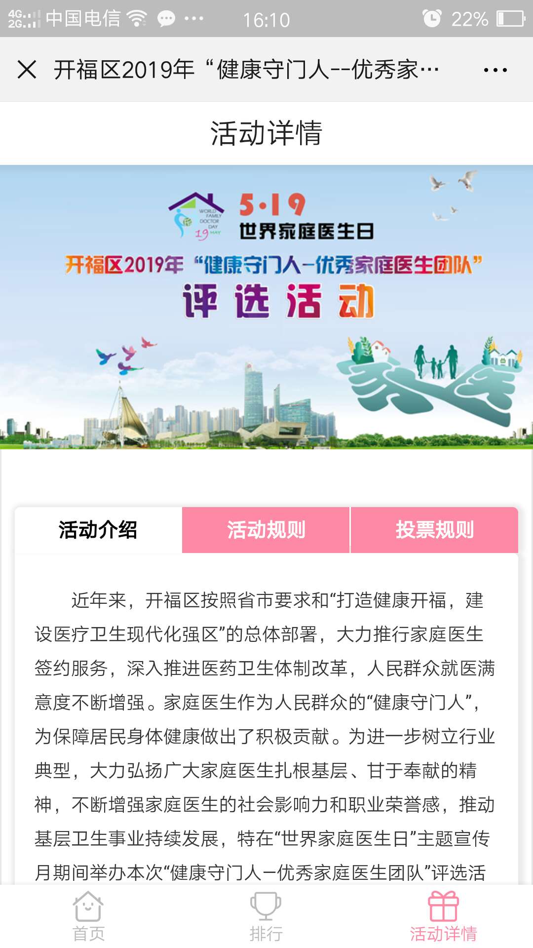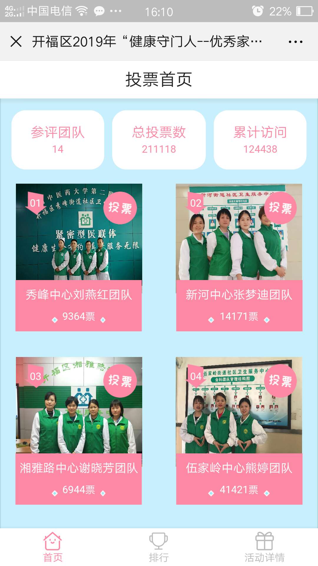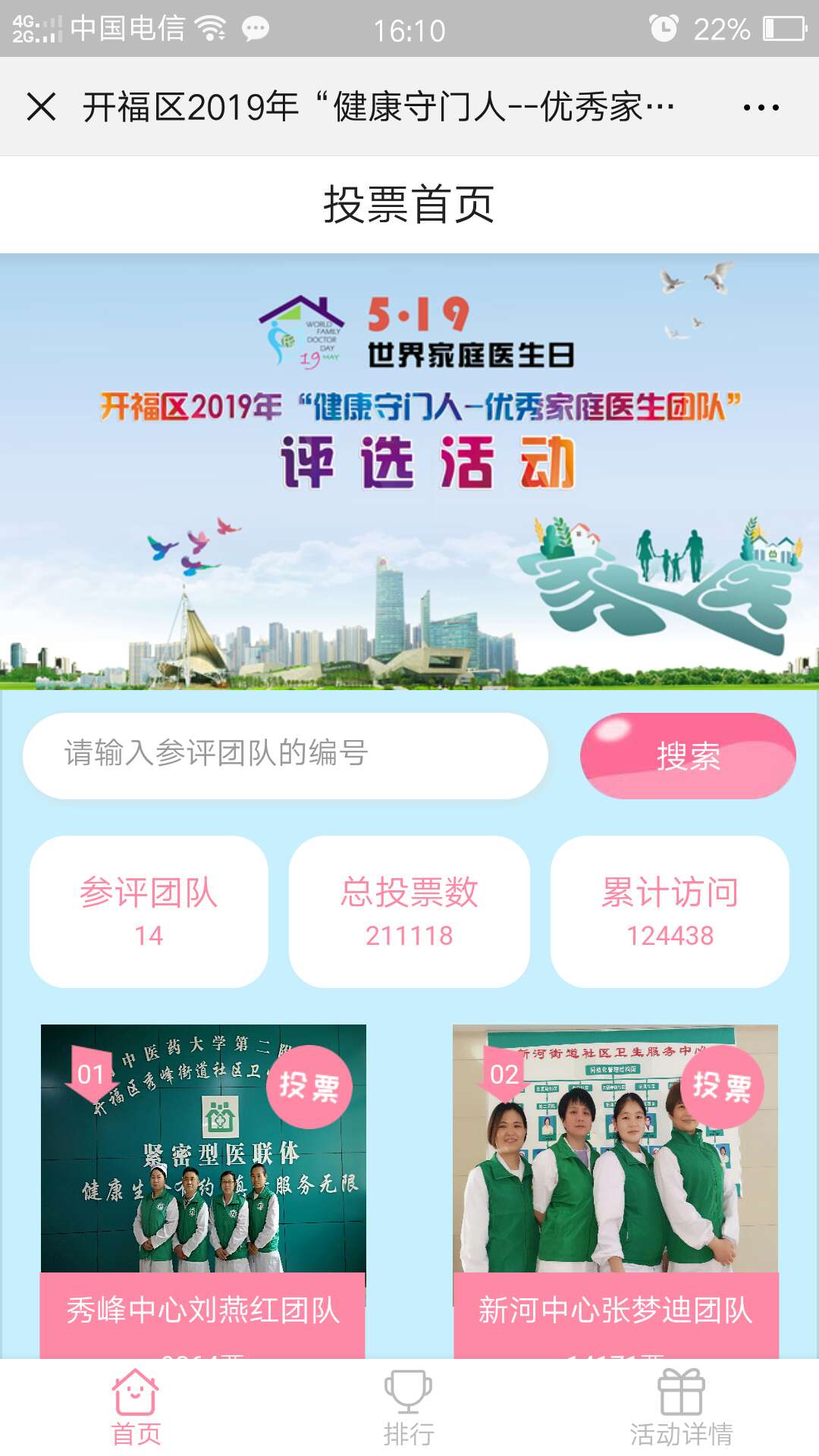 活动期间每天每个微信号可投5个家庭医生团队,每个团队每天最多可投5票。每个候选团队得票情况可实时显示。