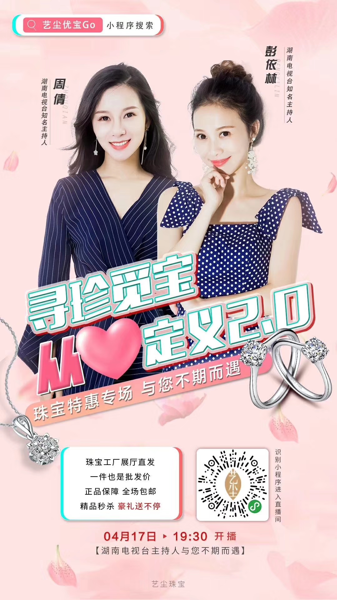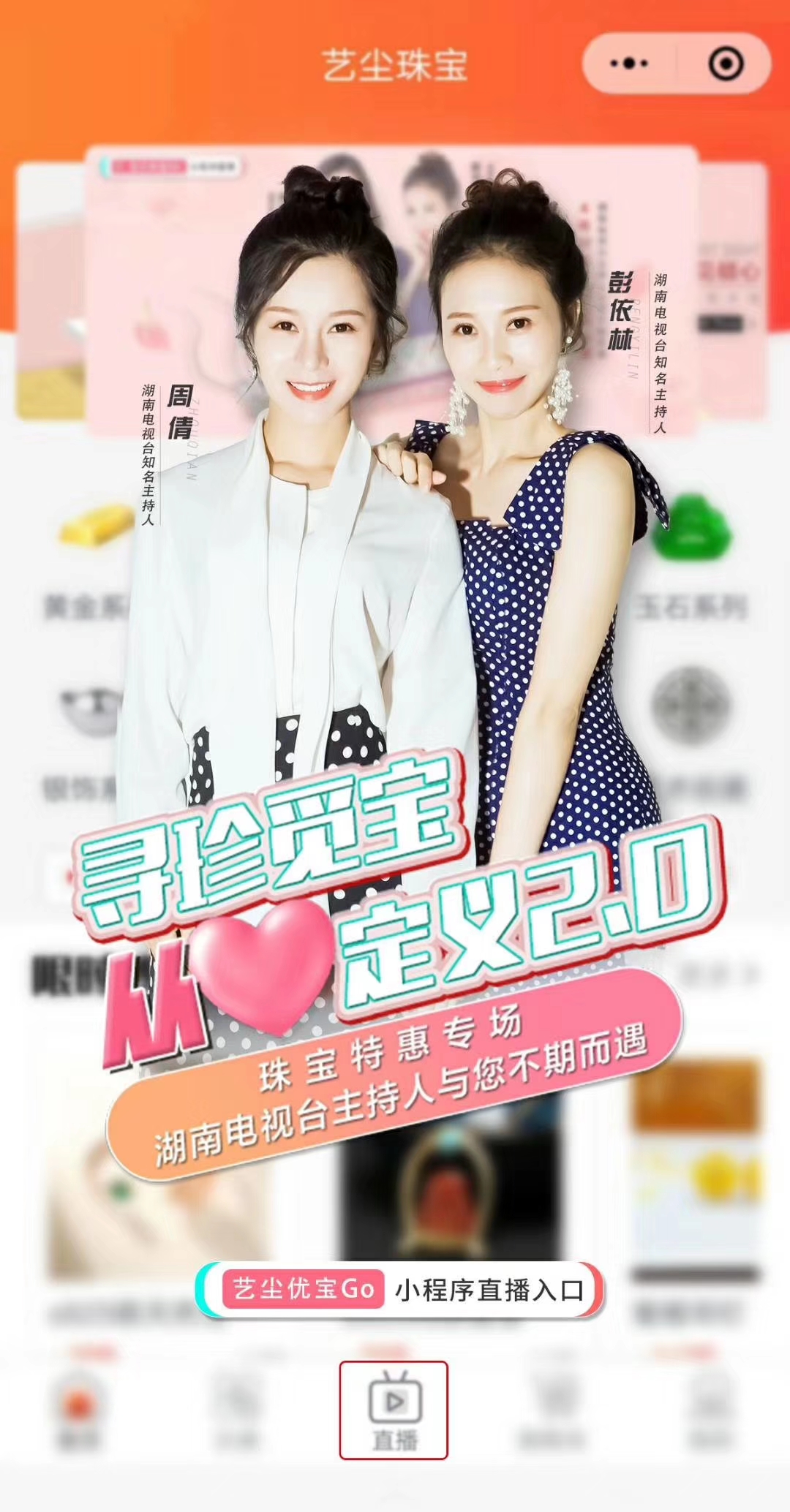 本次珠宝平台首发特惠专场特邀湖南电视台著名主持人、周倩、彭依林与您不期而遇!四轮豪礼送不停,全场批发价,福利多多!