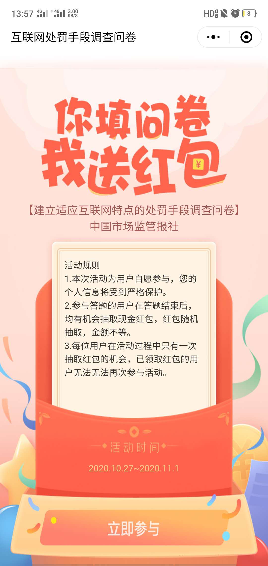 叮咚,您有一个问卷红包待领取,填完问卷就可以领现金红包了哦!这个调查问卷是中国市场监督局关于建立适应互联网特点的处罚手段进行开发的一填调查问卷领红包活动,由聚之唯网络提供技术支持!话不多说,赶紧来参与...