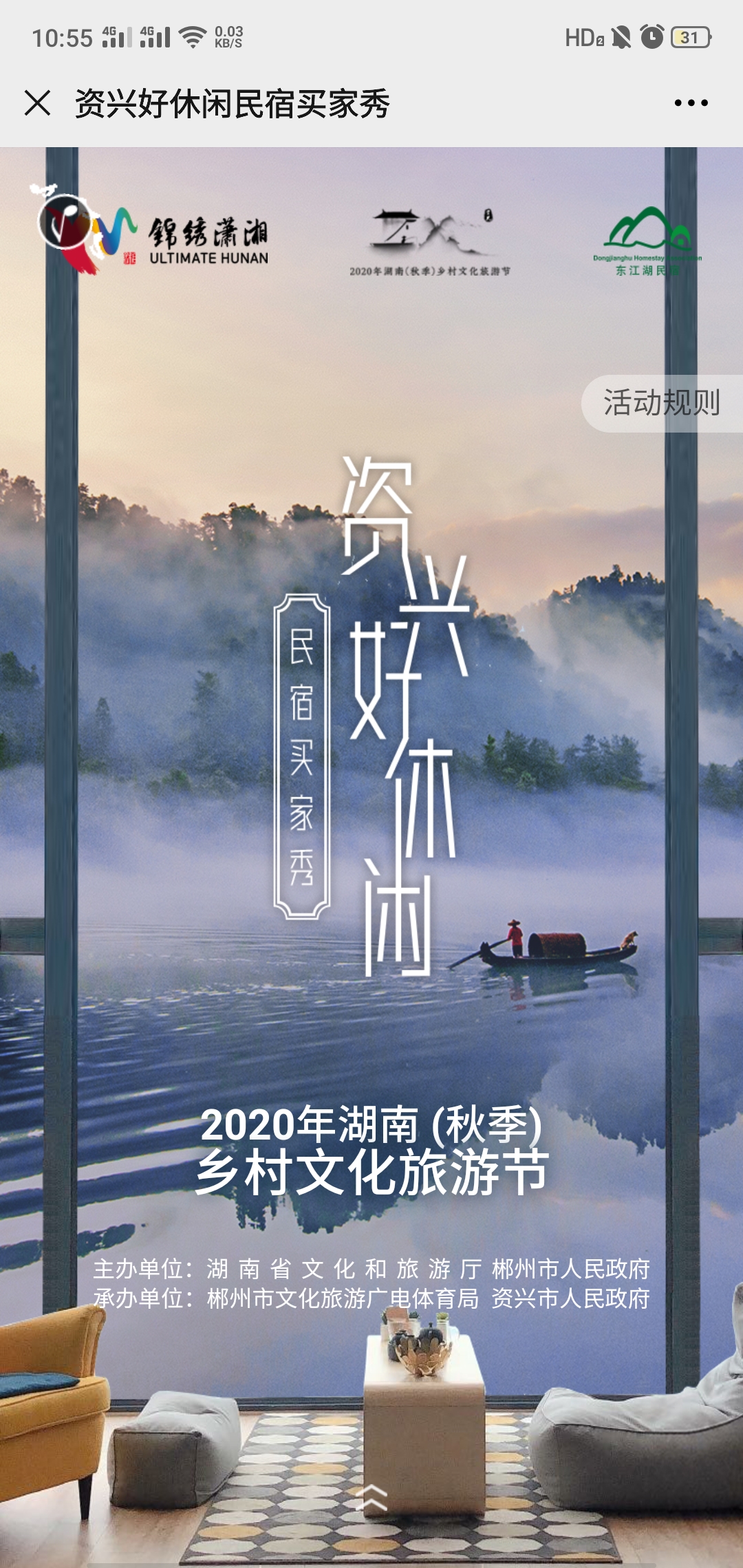 由湖南省文化和旅游厅、郴州市人民政府主办,郴州市文化旅游广电体育局、资兴市人民政府承办的资兴民宿体验报名活动由聚之唯网络提供技术支持!