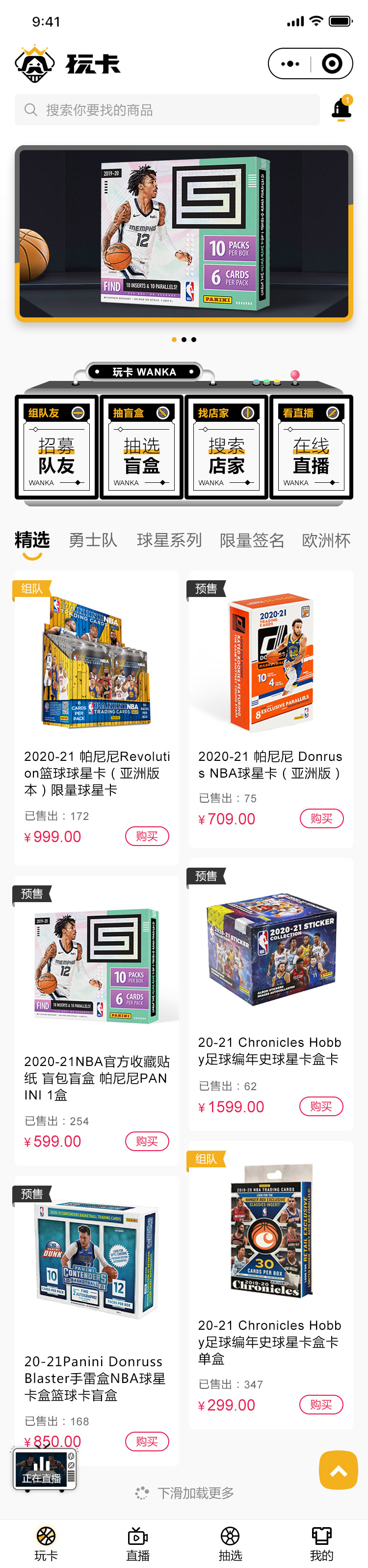 • 平台主要是给运动爱好者提供官方发行球星纪念卡,有直播开盲盒的娱乐形式可以赢得大奖,每张纪念卡内都有球星比赛时穿过的衣服,是运动迷们收集喜爱球星纪念品的乌托邦!