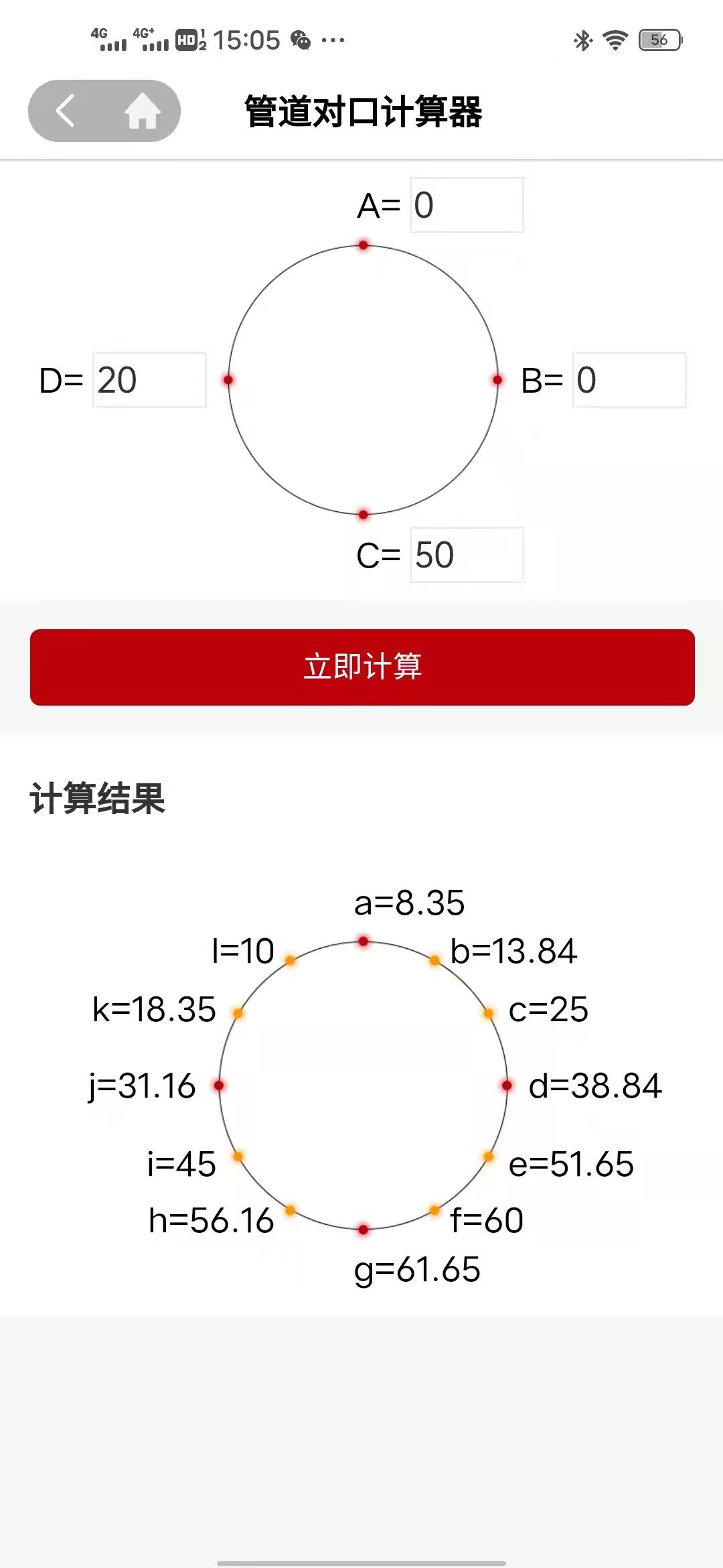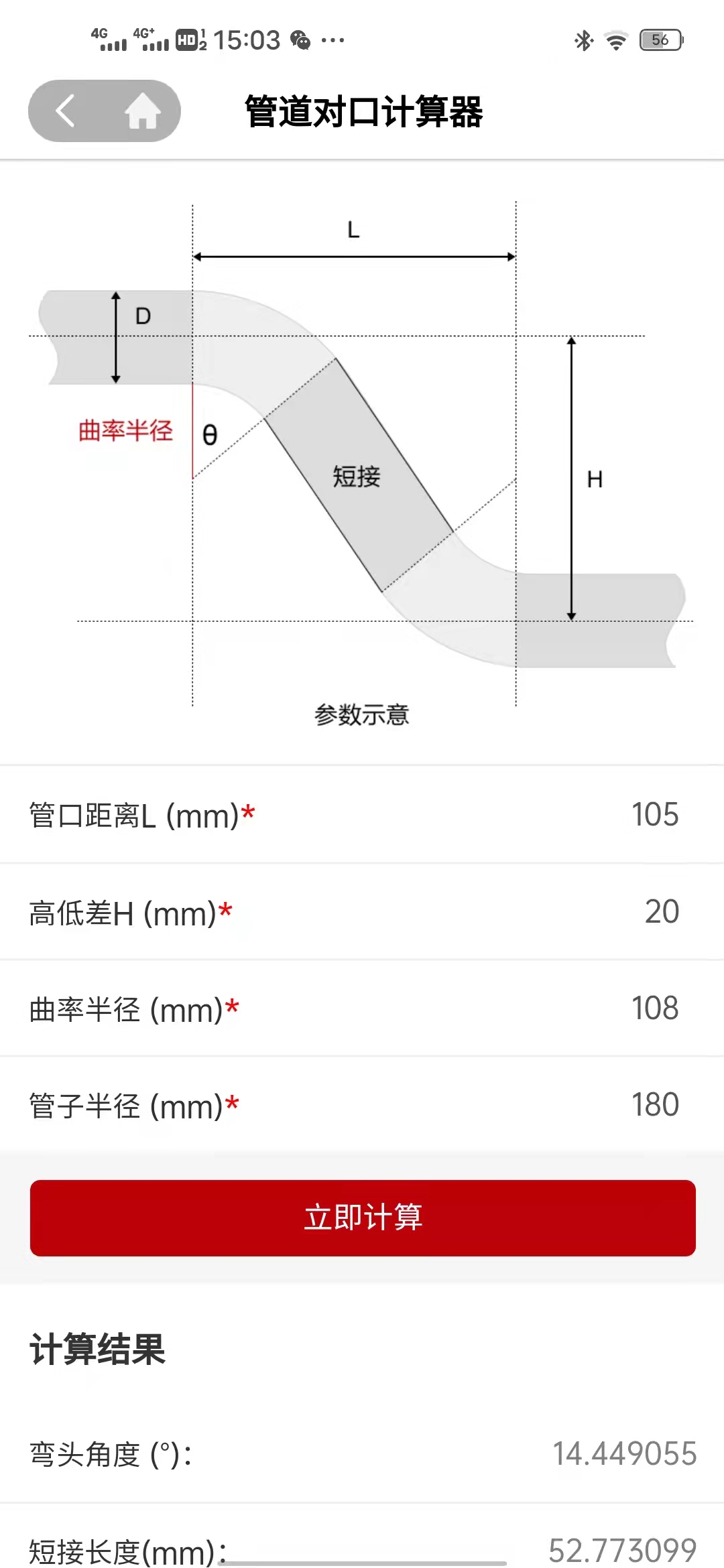 输入需要测量数据,如:管口距离、高低差H、曲率半径、管子半径即可计算出弯头角度、短接长度、外弧、中弧、内弧所需数据。